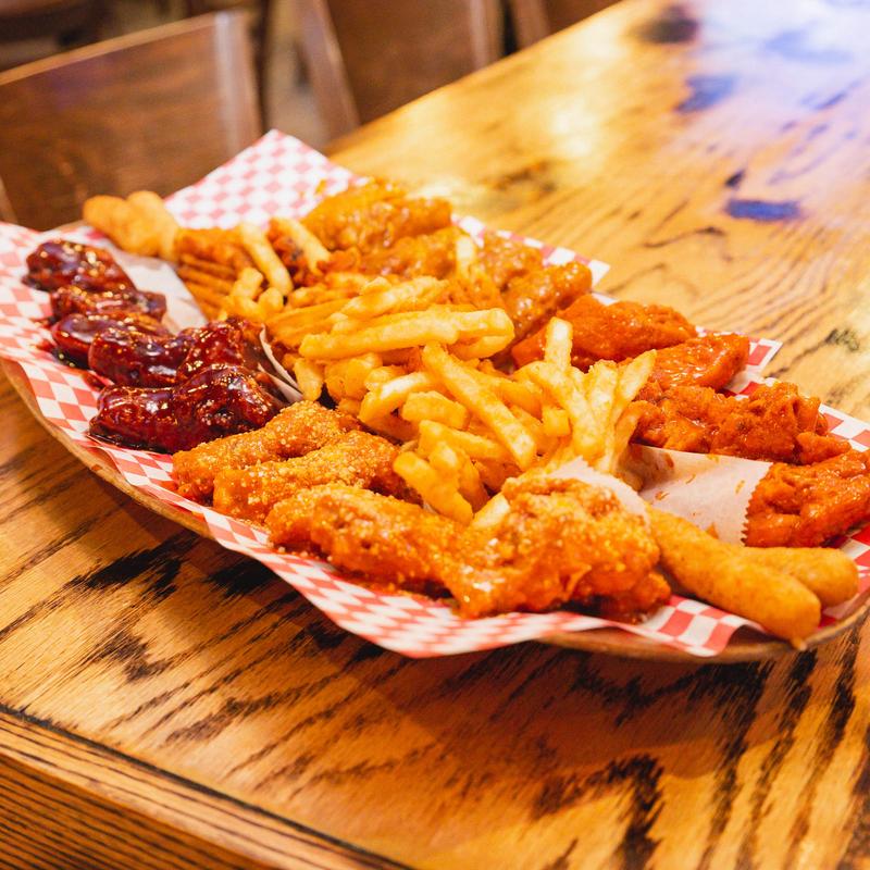 Choose between 20 naked, breaded, or boneless wings. Pick 5 flavors served with regular fries, waffle fries, and 4 mozzarella sticks